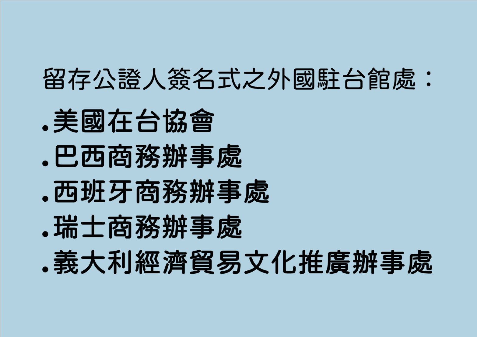 目前所知有留存公證人簽名樣式之外國駐台館處包括: