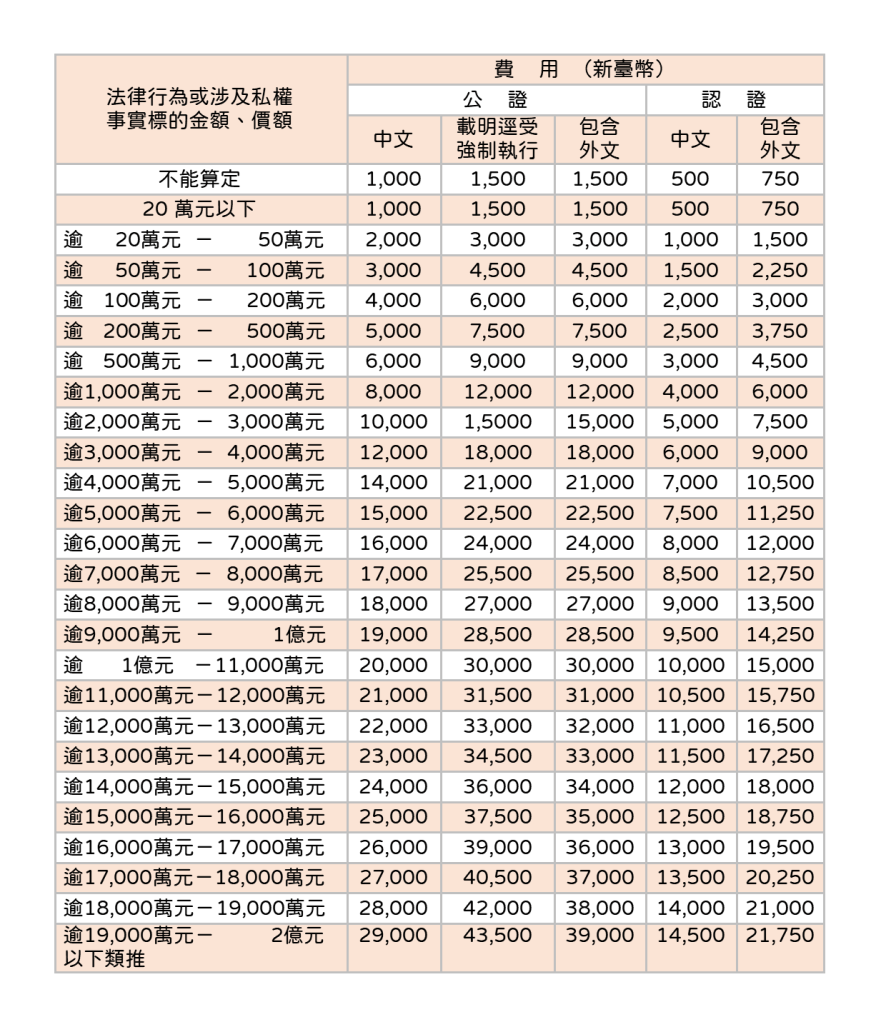 以房屋租約為例,【租金總額+押金】與【房屋現值+押金】取其中較高者,再找到公證費用標準表最左邊的價額欄位,就可以對照出一般中文公證書的費用及公證書載明逕受強制執行的費用。